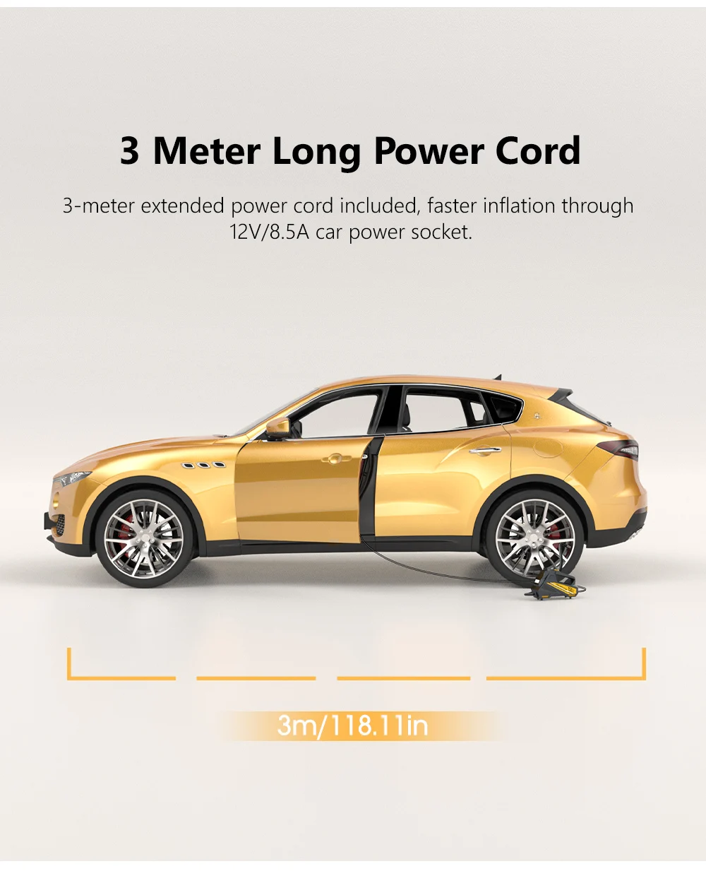 Cabo de alimentação de 3 metros de comprimentoCabo de alimentação estendido de 3 metros incluído, inflação mais rápida através de tomada de carro de 12V/8,5A.