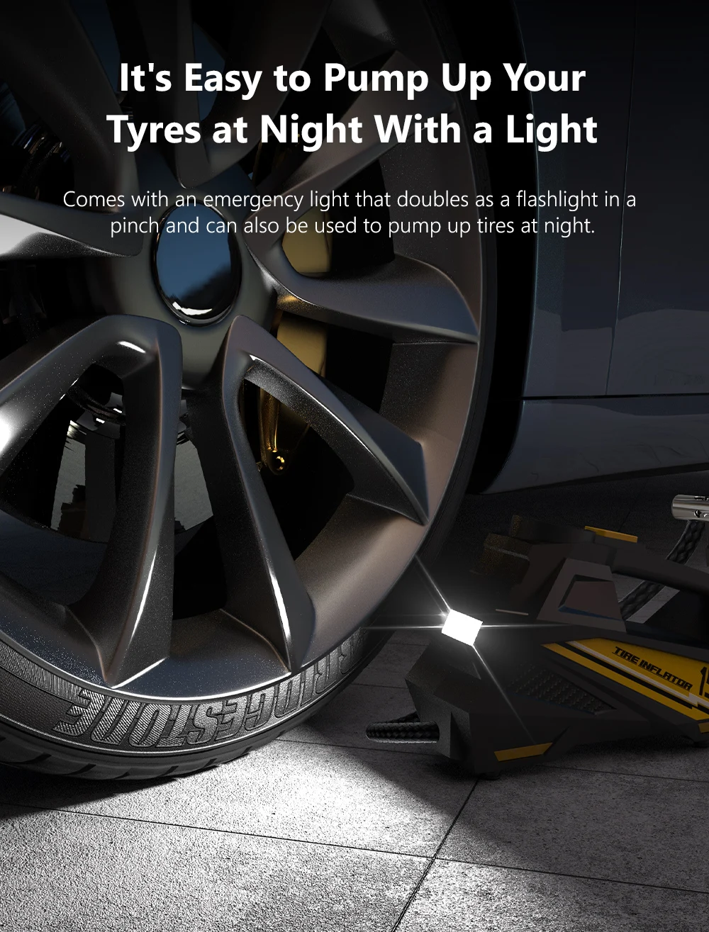 É fácil bombear seus pneus à noite com uma luzVem com uma luz de emergência que funciona como uma lanterna ao beliscar e também pode ser usada para bombear pneus à noite.
